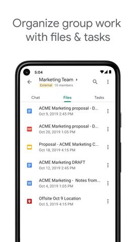 Key features of the app include group messaging, direct messaging, video and voice calls, screen sharing, and file sharing. Users can create chat rooms for team collaboration, assign tasks to team members, and share files directly from Google Drive. The app also integrates with other G Suite apps such as Google Docs, Sheets, and Slides for seamless collaboration.
